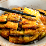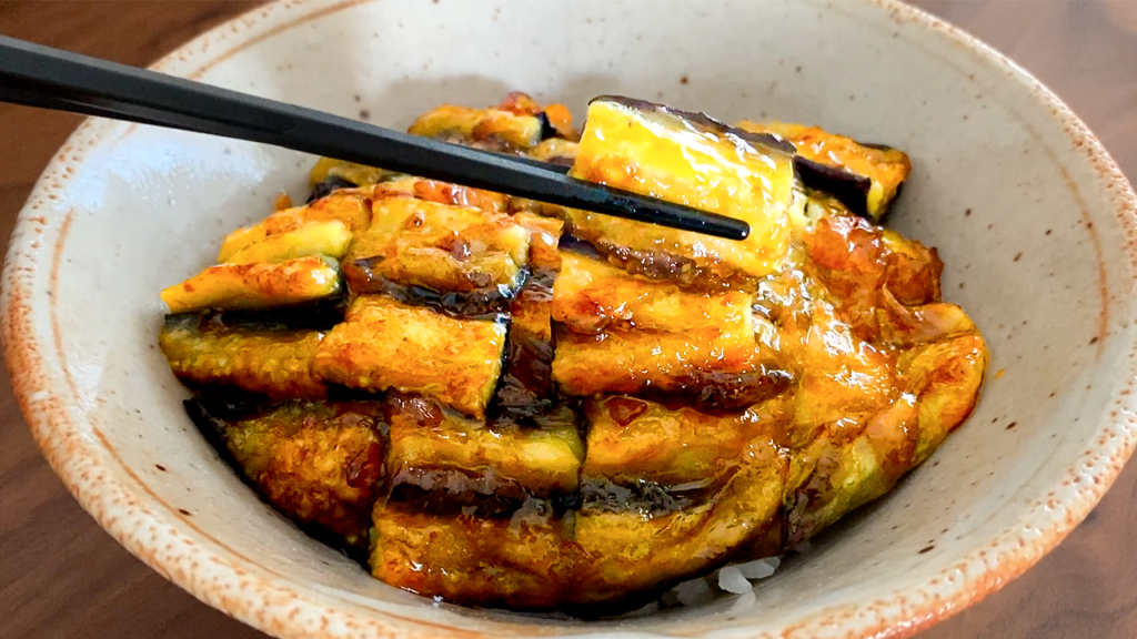 なすを開いて焼き、砂糖・みりん・醤油の甘辛だれで煮詰めると、見た目も味わいもまるで鰻の蒲焼きのような一品になります。メインのおかずとして、丼にしてもおいしいですよ。