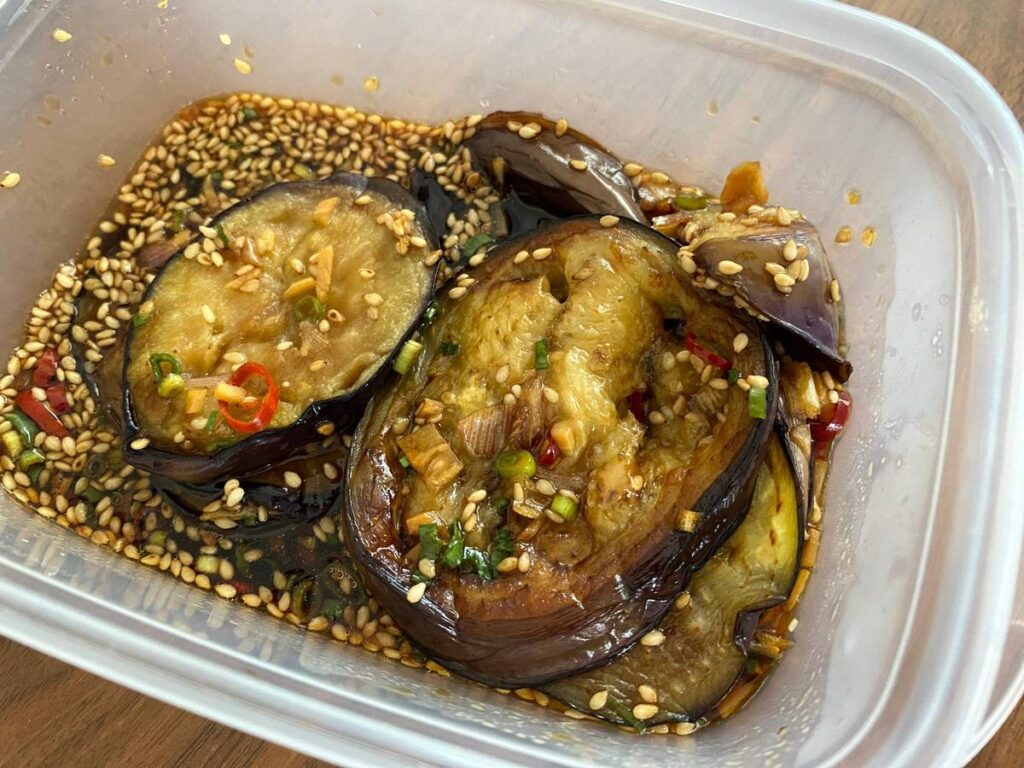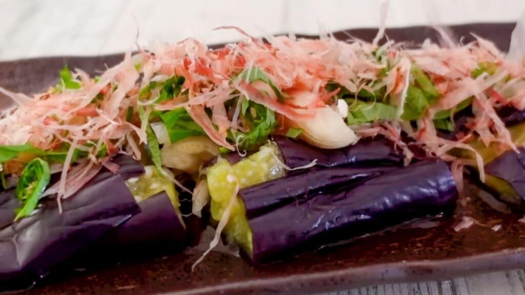 なすをごま油で焼き、醤油ベースのピリ辛だれに漬け込む一品です。みょうがや生姜の風味が効いていて、冷蔵庫で冷やすとさらに味が染み込みます。