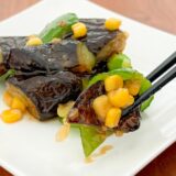 | なす×ピーマン×コーンの味噌バター炒め | 味噌とバターのこってり味でお酒がすすむ |