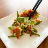 なすとツナ缶をマヨネーズで和えるだけの、手軽さが魅力の副菜です。レンジで2分加熱したなすを氷水で冷やし、ツナと和えるだけなので、あっという間に一品が完成します。