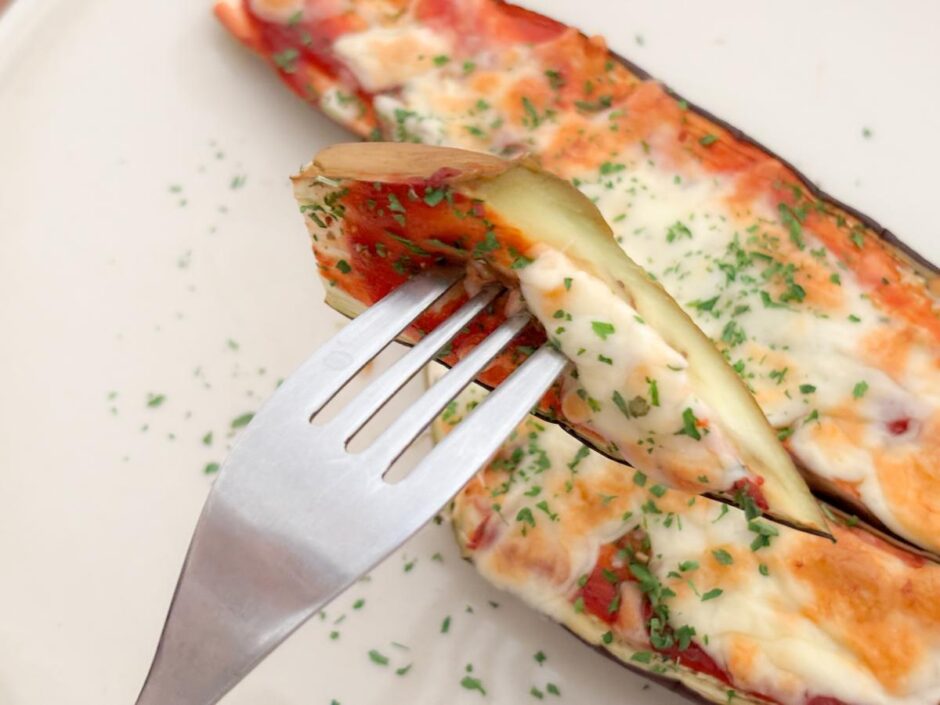 トースターでじっくり加熱したなすはとろりとやわらかく、まるでピザ台のような土台になります。ケチャップの酸味とハーブの香りがチーズのまろやかさと調和し、シンプルな材料とは思えない食べごたえです。