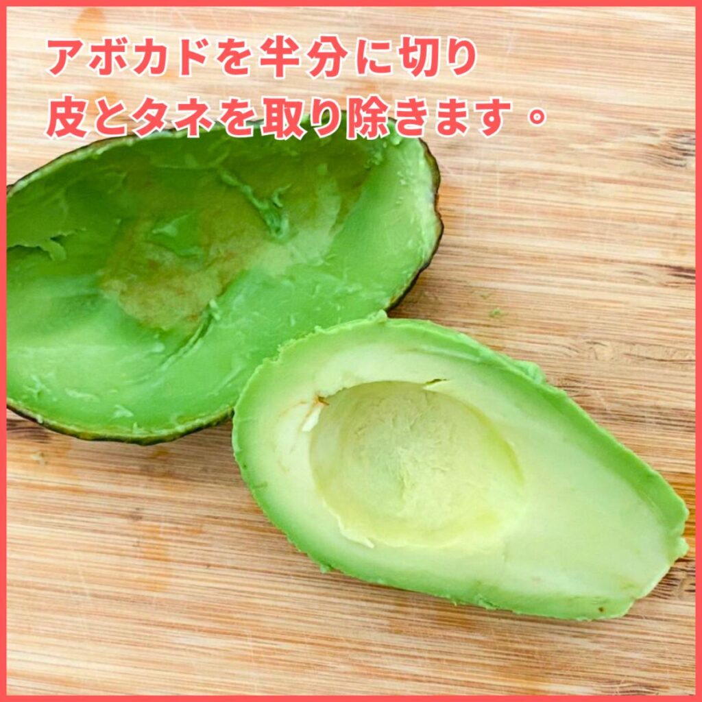 1)アボカドを半分に切り、皮とタネを取り除きます。