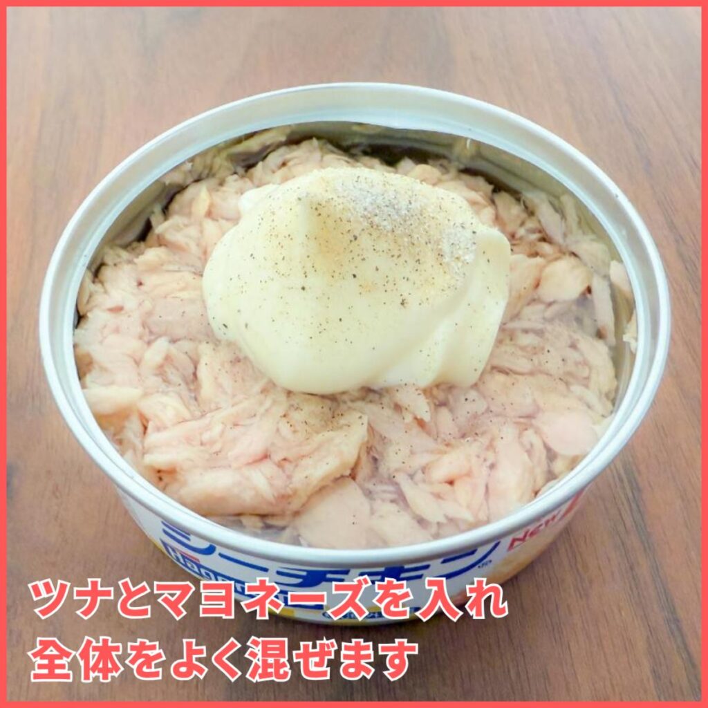4)ツナ缶とマヨネーズを入れ、全体をよく混ぜます。