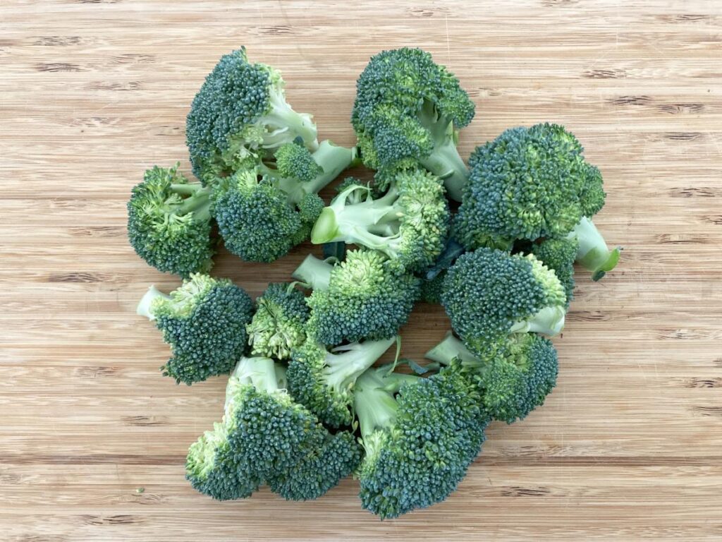 1)ブロッコリーは食べやすい大きさの小房に分けます。茎の部分も捨てずに薄切りにしておくと使えますよ。