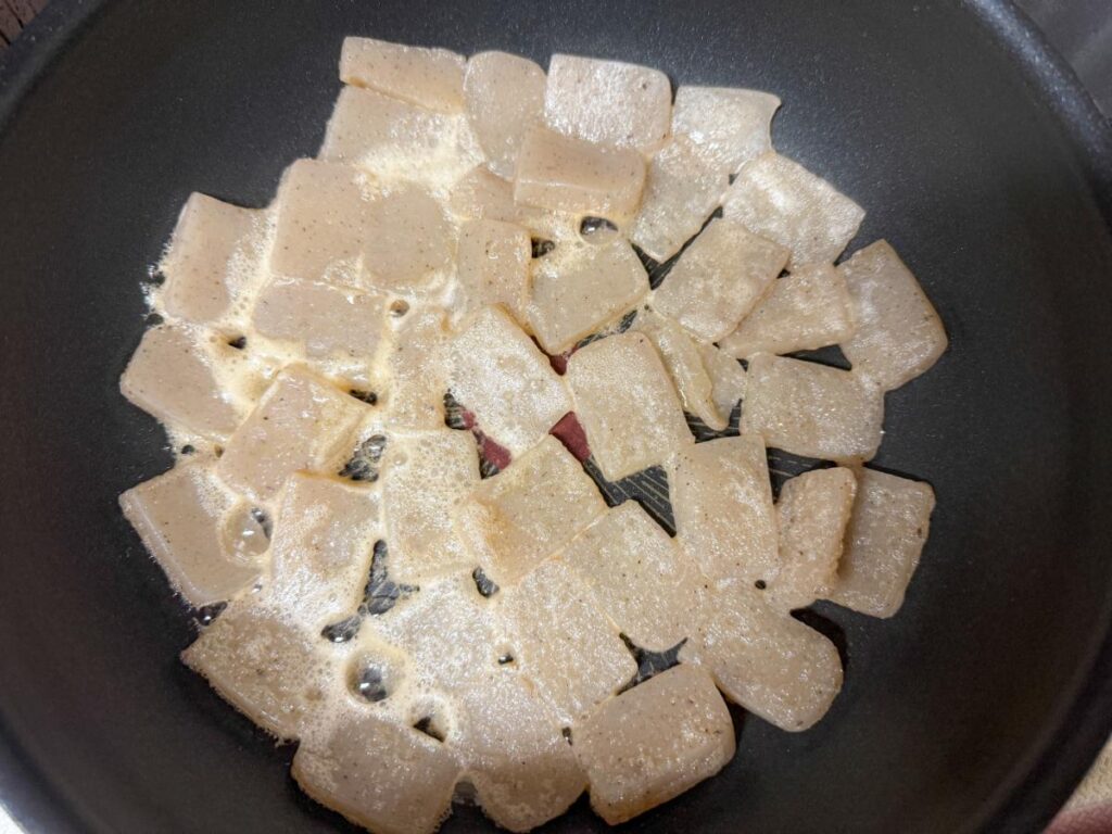 こんにゃくは水分が多いため、フライパンに入れる前によく水気を切っておくことが大切です。