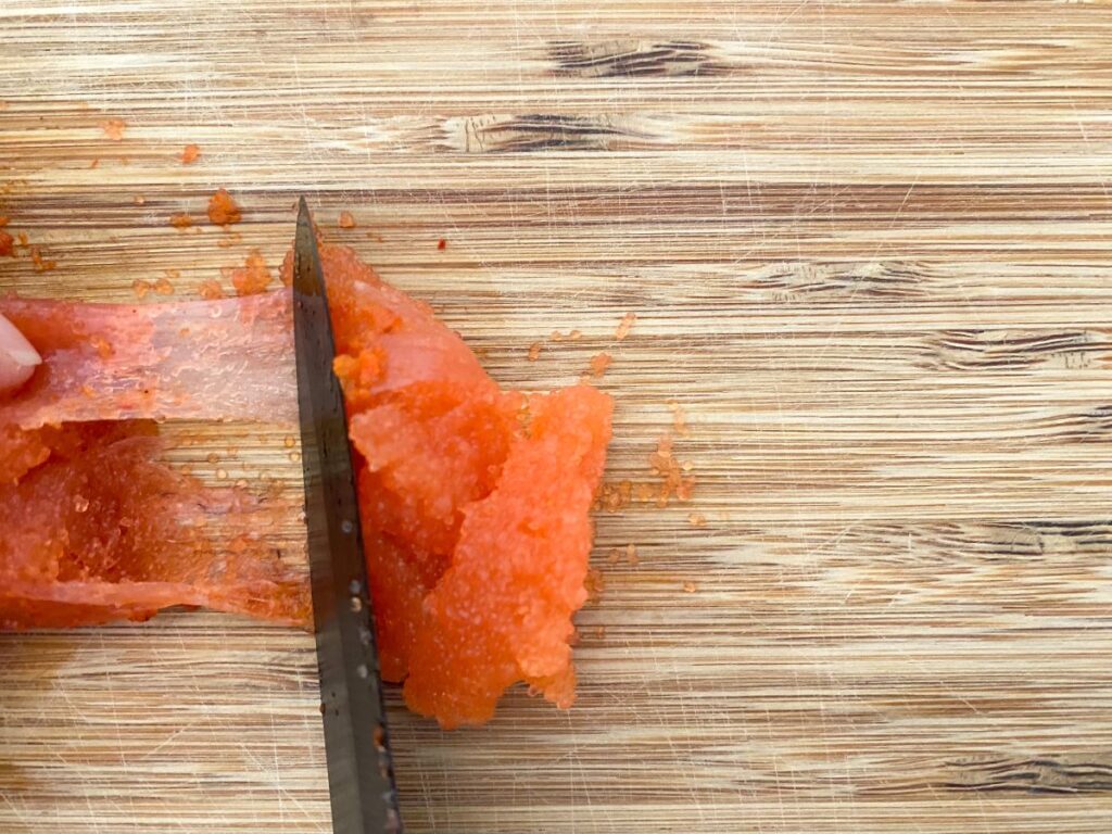 1) 明太子の薄皮をていねいに剥き、中身を取り出します。