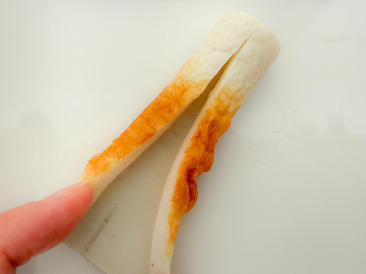2) ちくわに縦に切り込みを入れます。