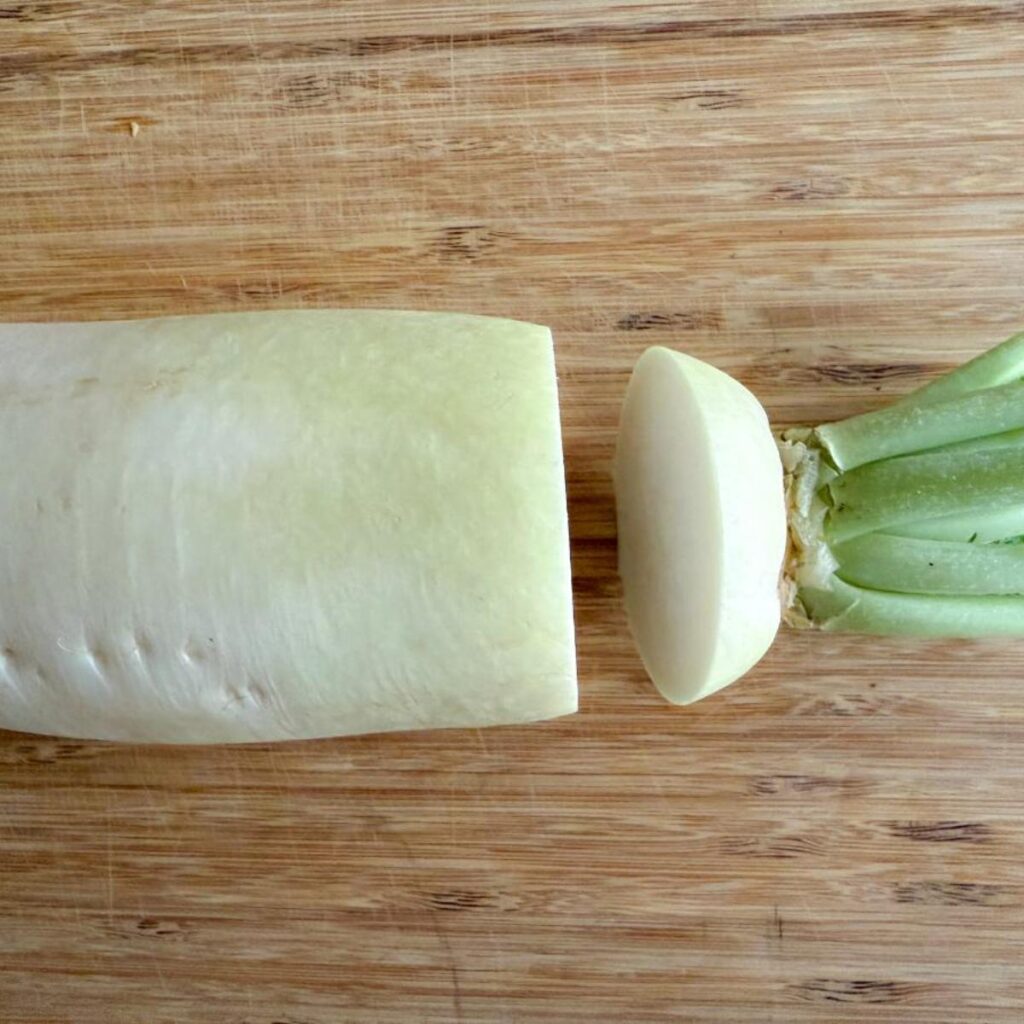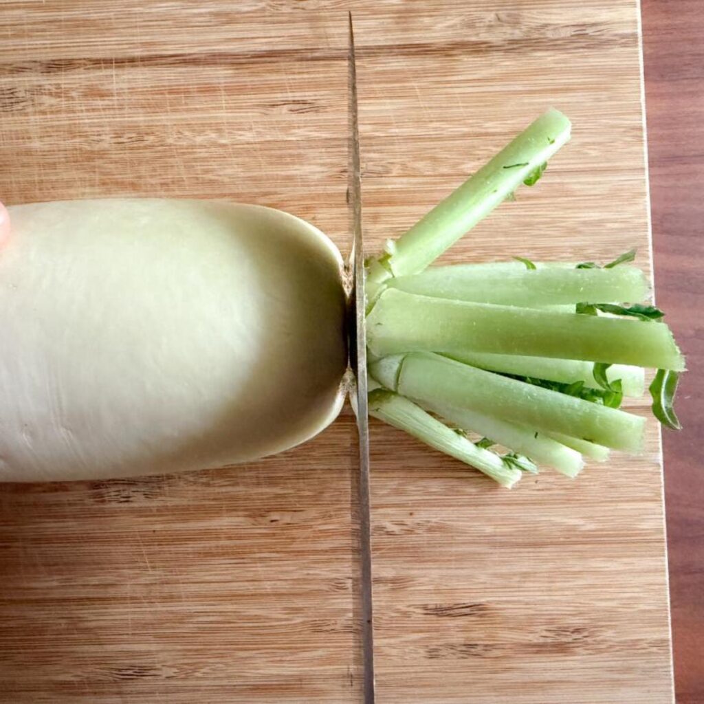 - 1)皮をむいた大根の首部分を、千切り(またはいちょう切り)にします。