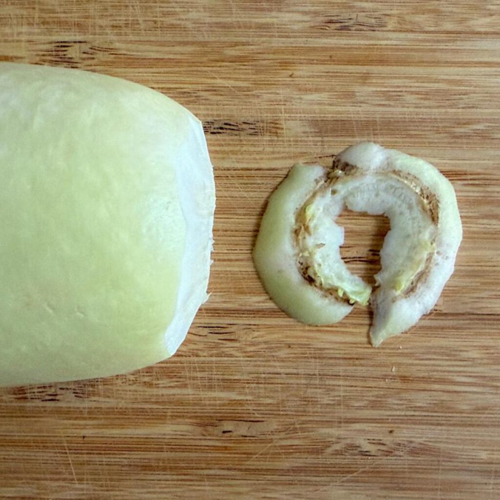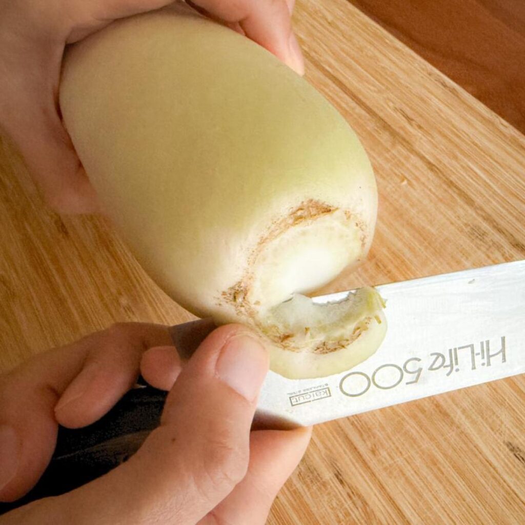 リンゴの皮をむくように、その茶色いリング部分だけを包丁で薄く削ぎ取ります。