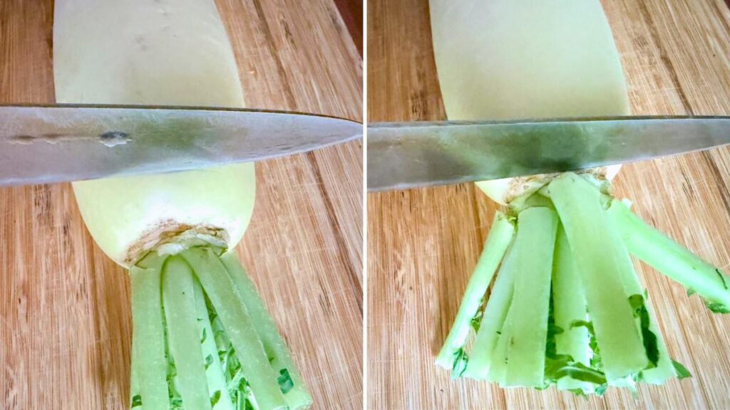 大根の実と葉っぱの境界線ギリギリを狙って切ります。この時点では、断面に茶色い茎の跡が残っていてOKです。
