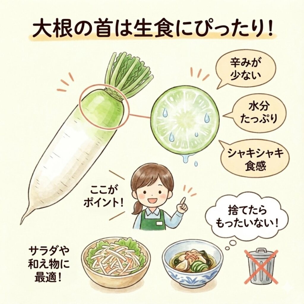 - 大根の首の特徴:辛みが少なく、みずみずしい。