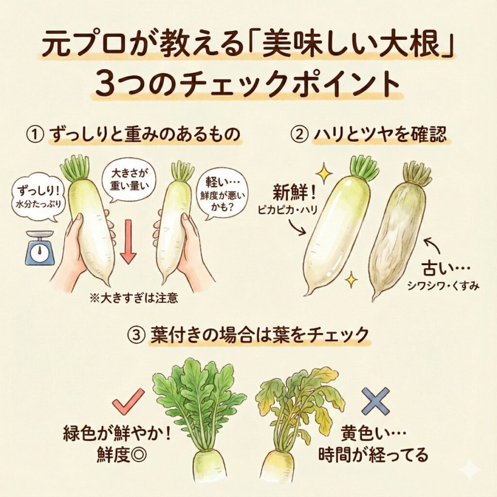次回の買い物で大根を選ぶときは、ぜひ「重さとツヤ」を確認して、お家で試してみてくださいね!