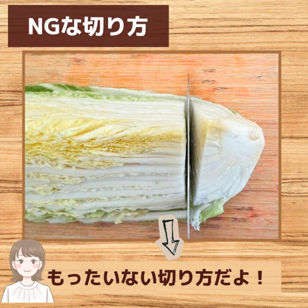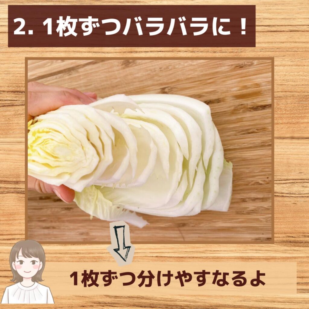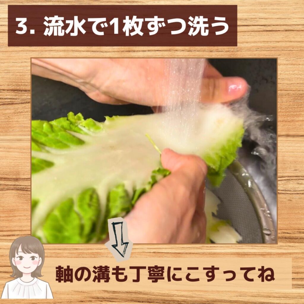 だからこそ、最初に“芯を少し切り落とす”のがポイント。葉が自然にバラけて、1枚ずつ洗えるようになるんだよ。