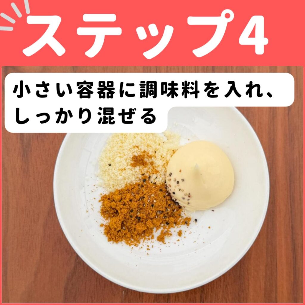 小さい容器に、マヨネーズ、カレー粉、粉チーズ、粗びき黒こしょうを入れ、
