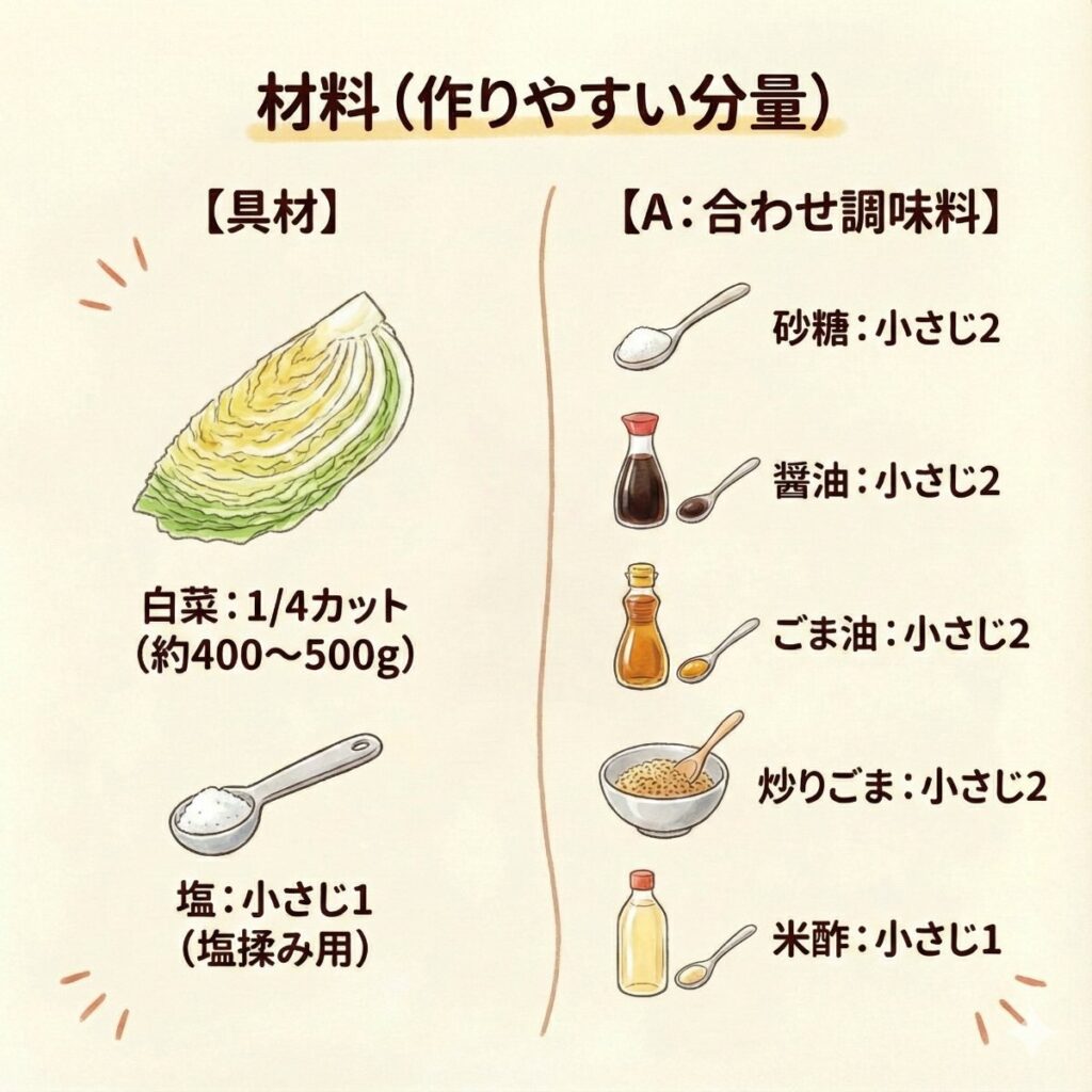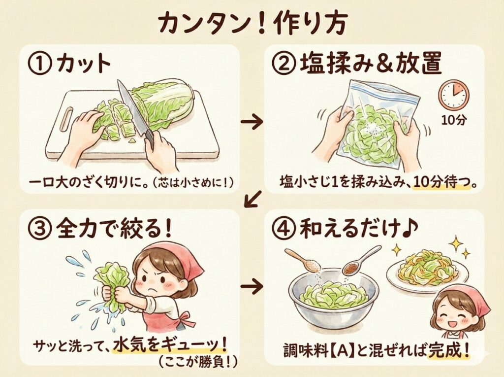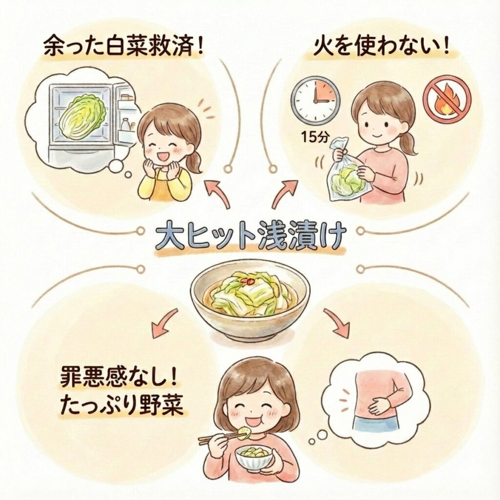 火を使わず、ポリ袋やボウル一つで完結。驚くほどご飯が進むので、これを知れば「白菜が足りない!」という事態になりますよ。