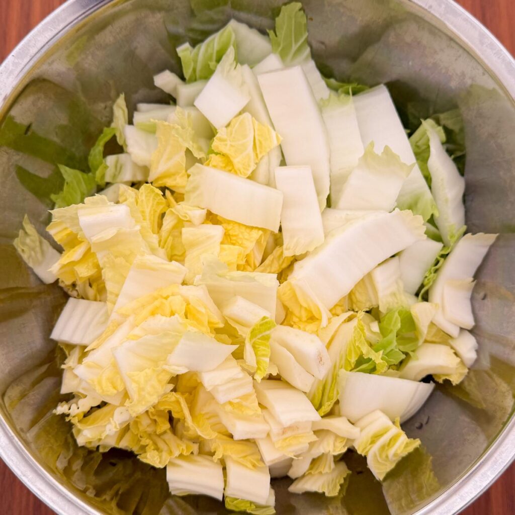 白菜は芯を取り除き、葉を一枚ずつ洗います。食べやすい一口大のざく切りにしましょう。