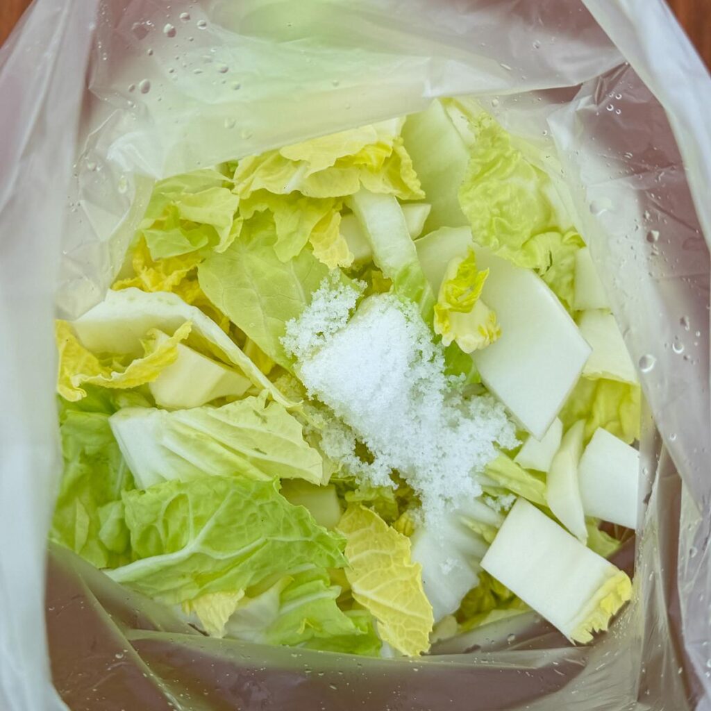 そのまま10分ほど放置して、白菜の汗(水分)が出るのを待ちましょう。