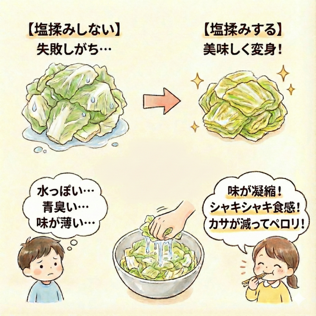 - 塩揉みで水分を抜き、食感と味の染みを良くする