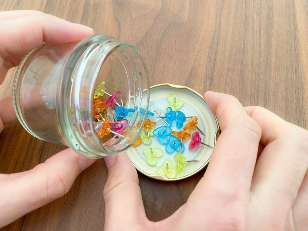 使うときは、フタの上に押しピンを出すと取りやすくなります。直接手を瓶の中に入れなくて済むので、指先を刺すリスクも減らせます。