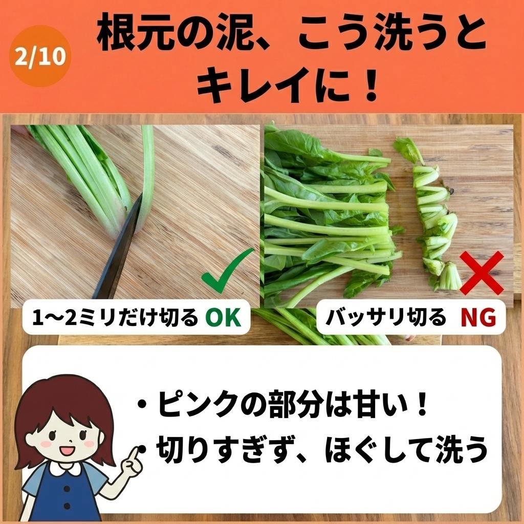 ほうれん草の根元には泥が入り込んでいることがありますよね。