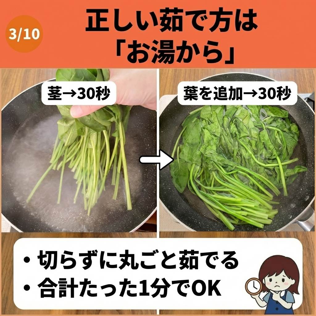 茎を先にお湯に入れて約30秒、そのあと葉を入れてさらに30秒。合計約1分で引き上げて冷水で色止めすれば、シャキシャキの食感と鮮やかな色を両立できます。