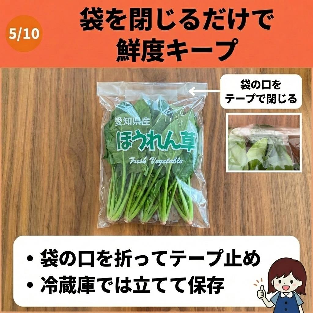 スーパーで売られているほうれん草の袋は上部が開いているものが多く、そのままだと水分が蒸発して葉がすぐにしなびてしまいます。