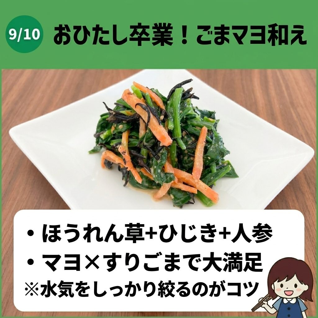 マヨネーズのコクとすりごまの香ばしさ、人参の彩りが加わることで、おひたしとはまったく違う満足感のある味わいになります。