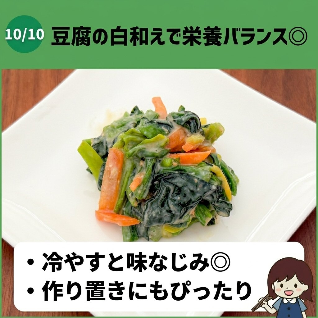 豆腐のタンパク質、ほうれん草のビタミンA・鉄分、人参のβカロテン、ごまの食物繊維・ビタミンEと、一品で栄養バランスがしっかり整います。