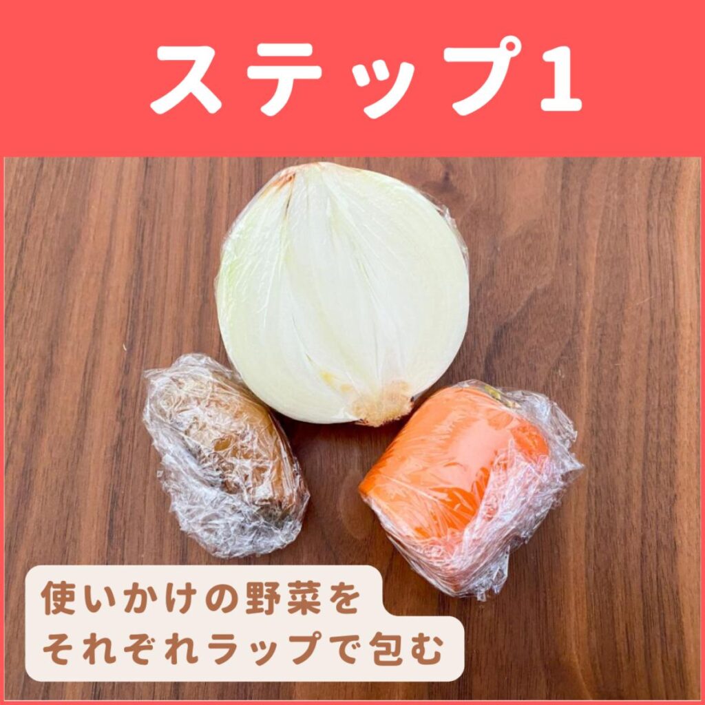 1)使いかけの野菜を、それぞれラップで包む