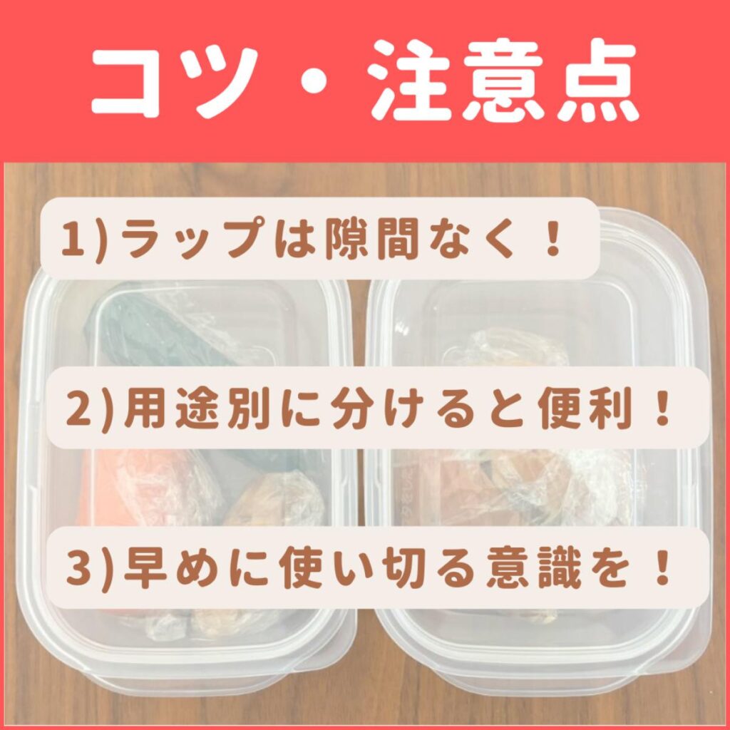 - 用途別に分けると便利! タッパーに入りきらないほど野菜がある場合は、「サラダ用」「炒め物用」など、用途別に分けてタッパー保存すると、取り出すときにもっと楽になります。