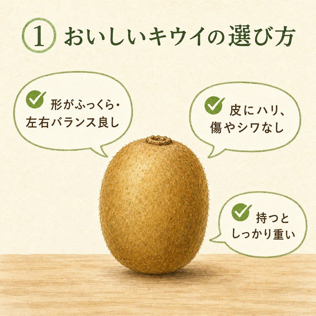 - 店では「形がふっくら・皮にハリ・しっかり重み」のあるキウイを選ぶのがポイントです
