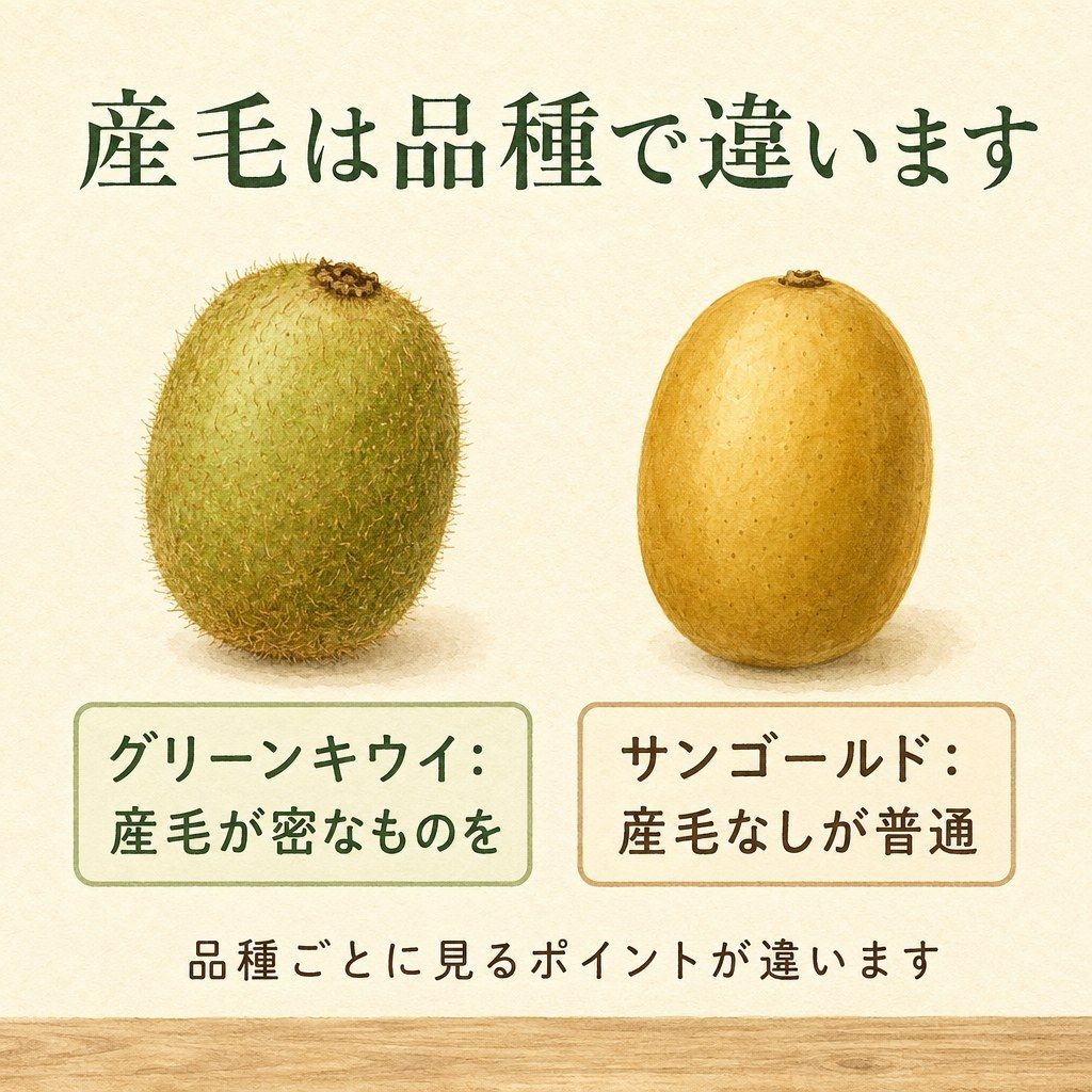 特にグリーンキウイの場合は、表面の産毛が密に残っていてこすれや剥げが目立たないものが、店頭での扱いがていねいで状態も良いことが多いですよ。