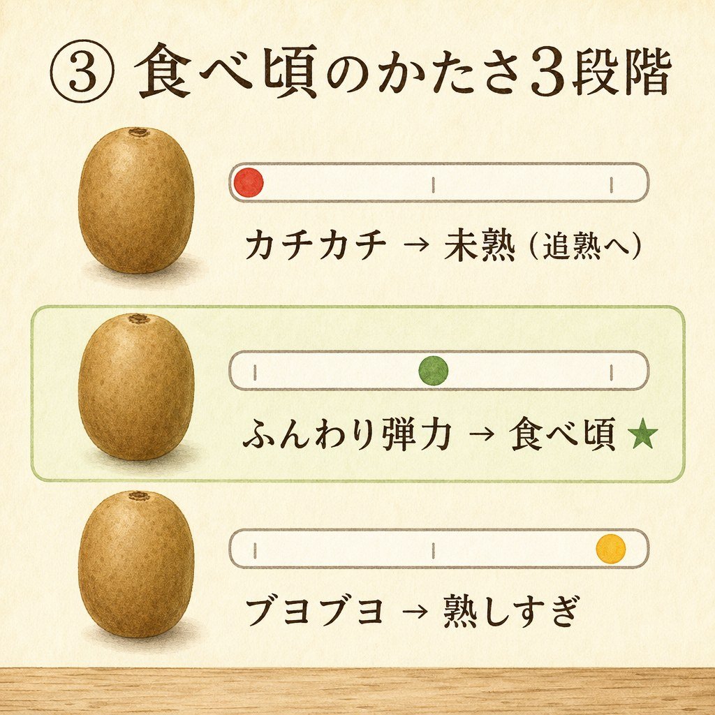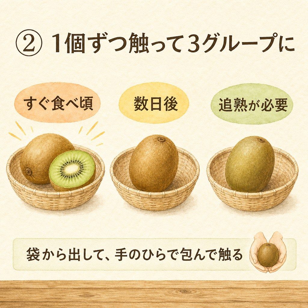 キウイは個体ごとに熟すスピードが異なるため、袋から出してそのまま放置せず、1個ずつ手のひらでそっと包むように触り、次の3グループに分けてみてください。