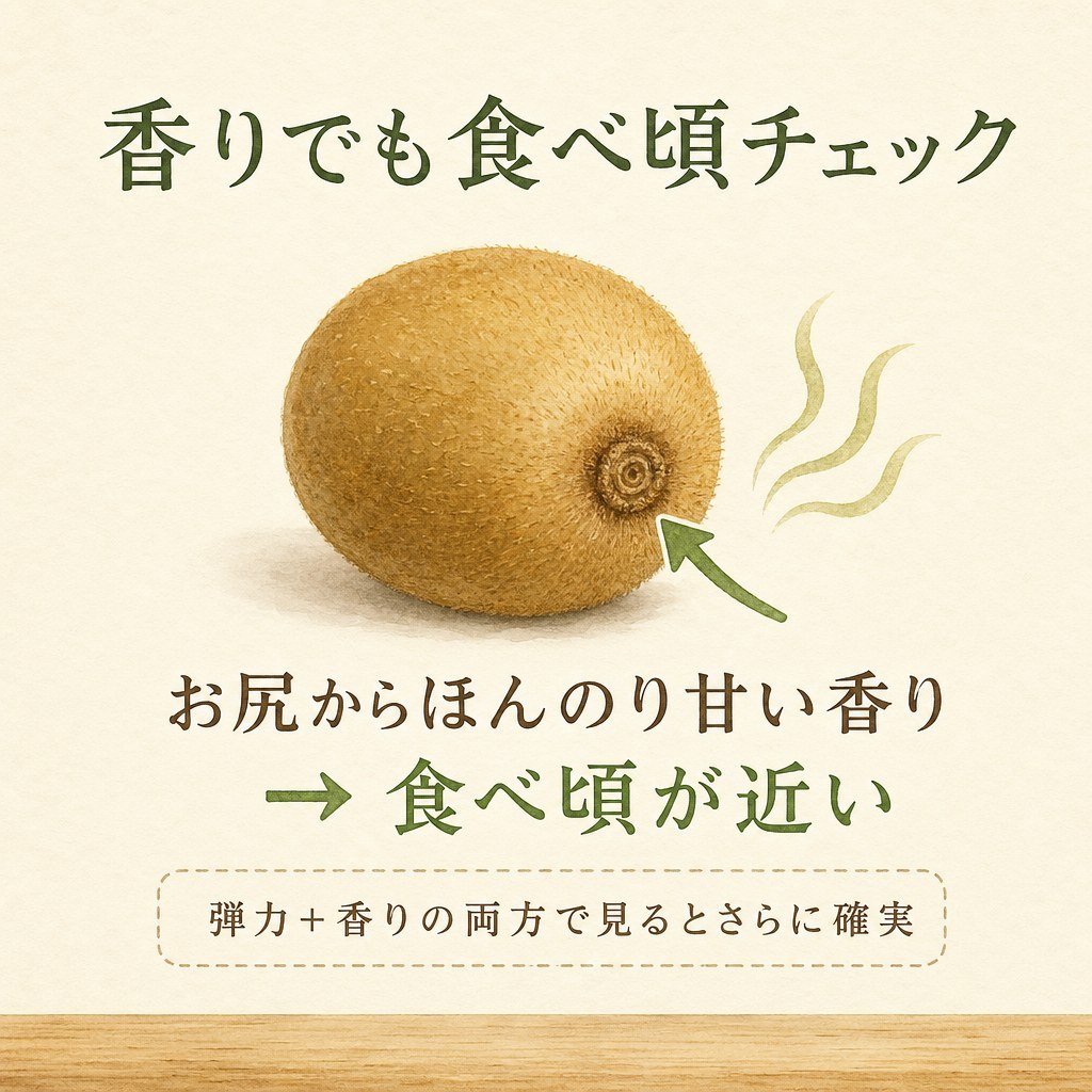 迷ったときは、香りもチェックしてみてください。お尻(軸と反対側)の部分に鼻を近づけて、ほんのり甘い香りがすれば食べ頃が近づいているサインですよ(参照:ゼスプリ公式「保管は常温?冷蔵? 食べごろの見分け方は?」)。