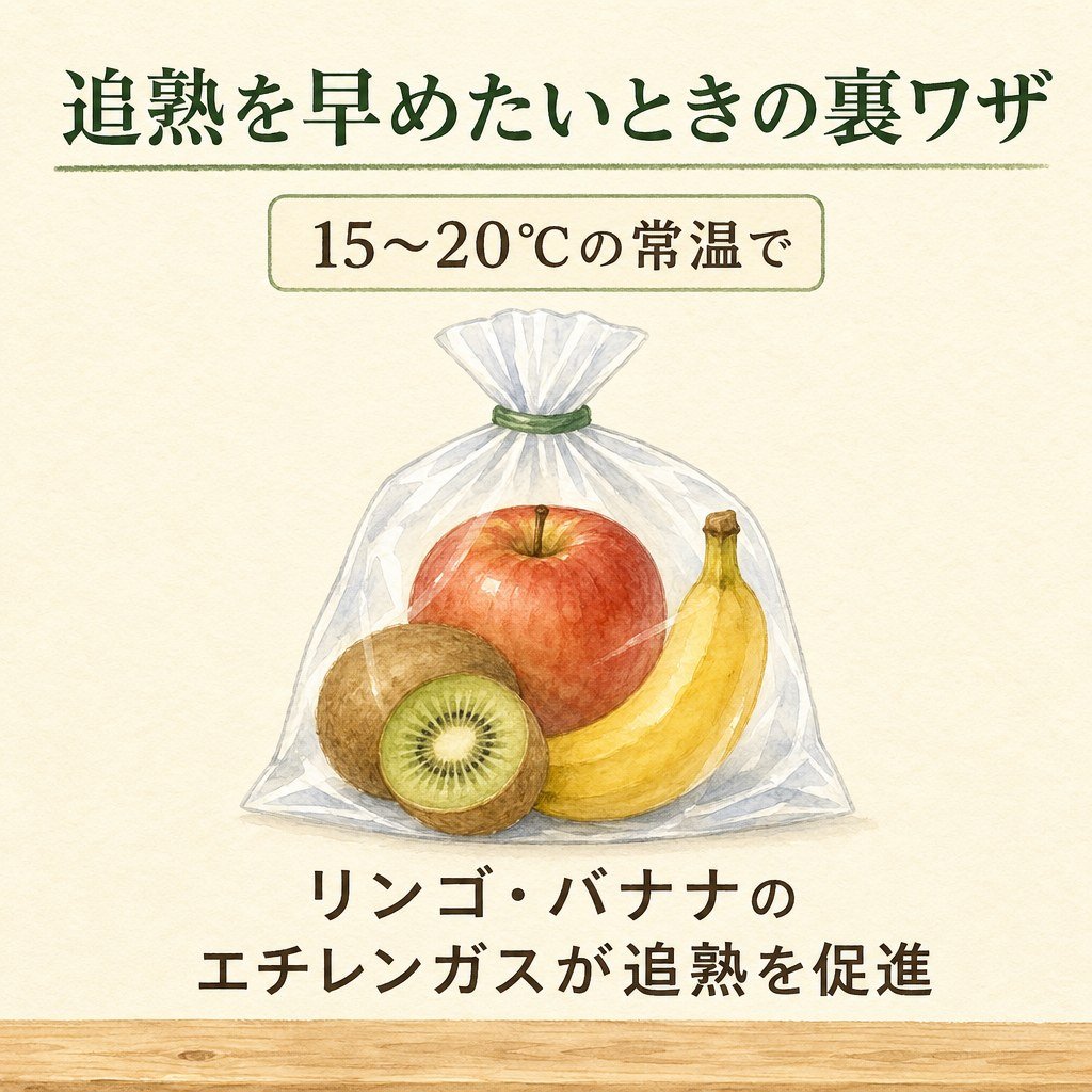 - 追熟を早めたいときは、リンゴやバナナとビニール袋に入れる方法が便利です