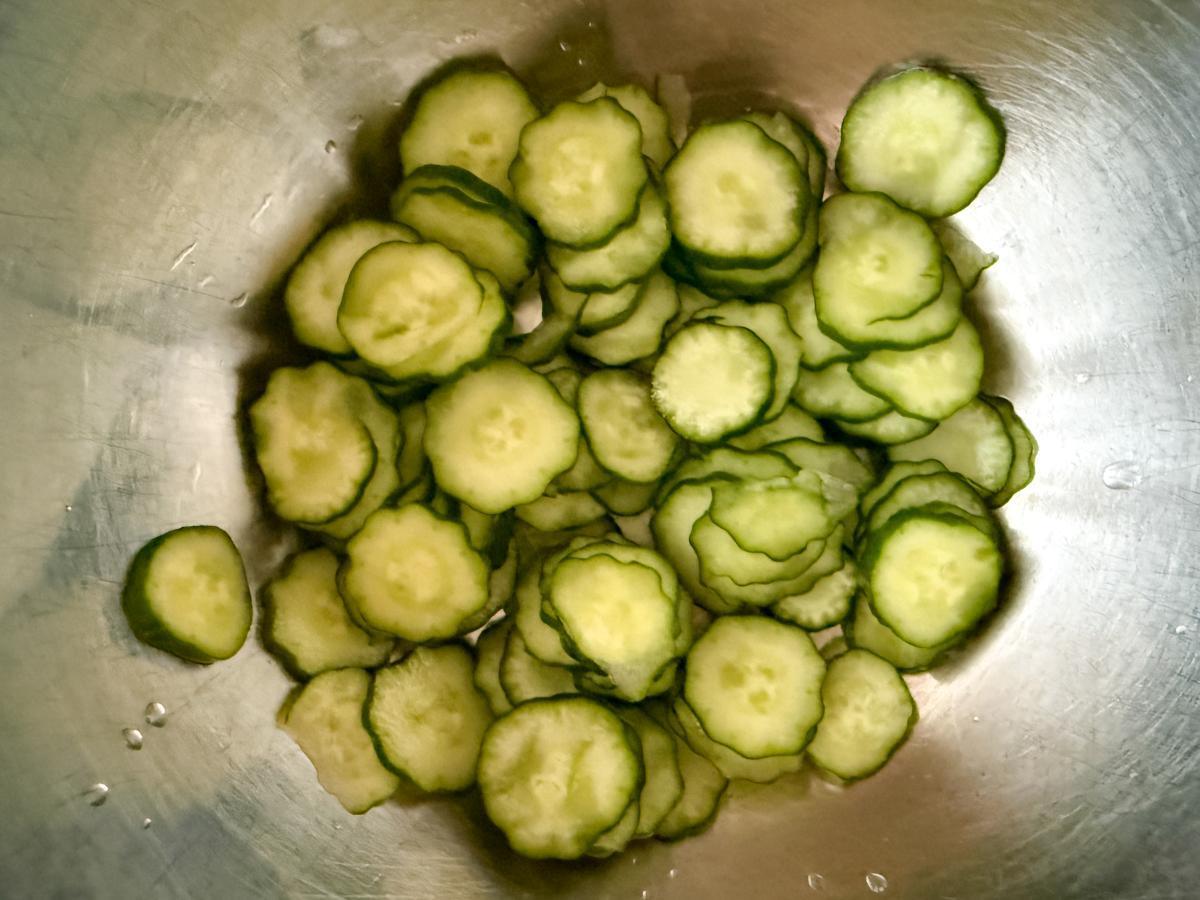 1) きゅうりは輪切りにして塩をふり、しんなりしたら水で洗ってしっかり絞ります。
