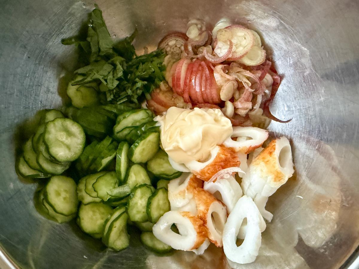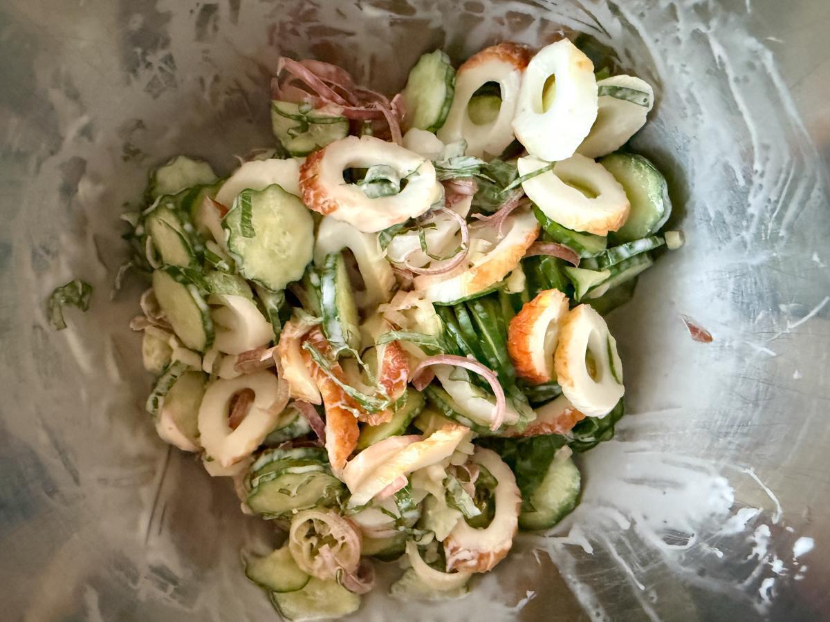 きゅうりのシャキシャキ感にちくわの旨み、大葉とみょうがのさわやかな香りが加わって、さっぱりなのに食べごたえのある一品に仕上がります。
