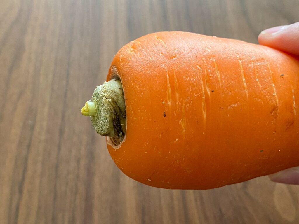 人参の頭(ヘタ)の部分にある芯を見てください。ここから小さな緑色の芽が出ているものは、収穫から時間が経っている証拠です。成長しようとして本体の栄養を使っている状態なので、味が落ちている可能性があります。