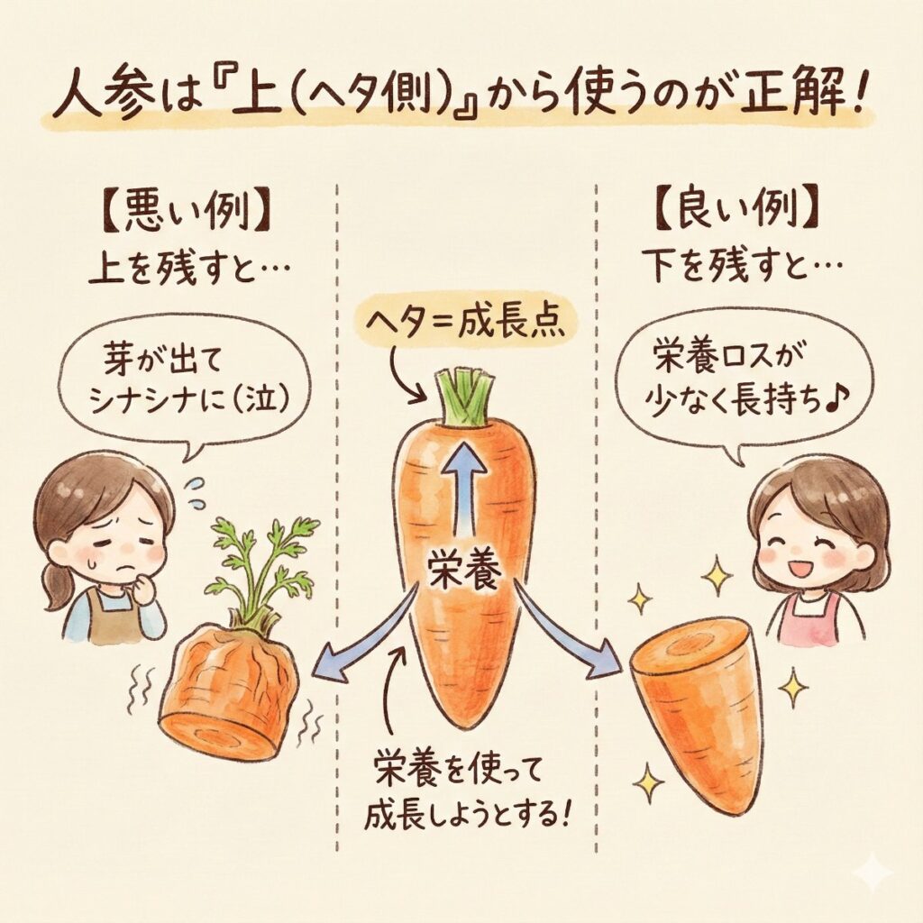 人参のヘタの部分には成長点があり、そこから葉を伸ばそうとする性質があります。たとえ葉っぱが切り落とされていても、成長点は生きています。そのため、上(ヘタ側)を残して保存すると、人参は自分の栄養を使って成長しようとし続けるのです。