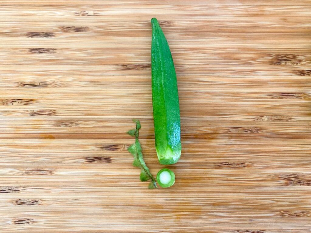 1)オクラに塩をふって板ずりし、ガクのまわりの黒っぽい部分をぐるりとむいてからヘタの先を落とします。