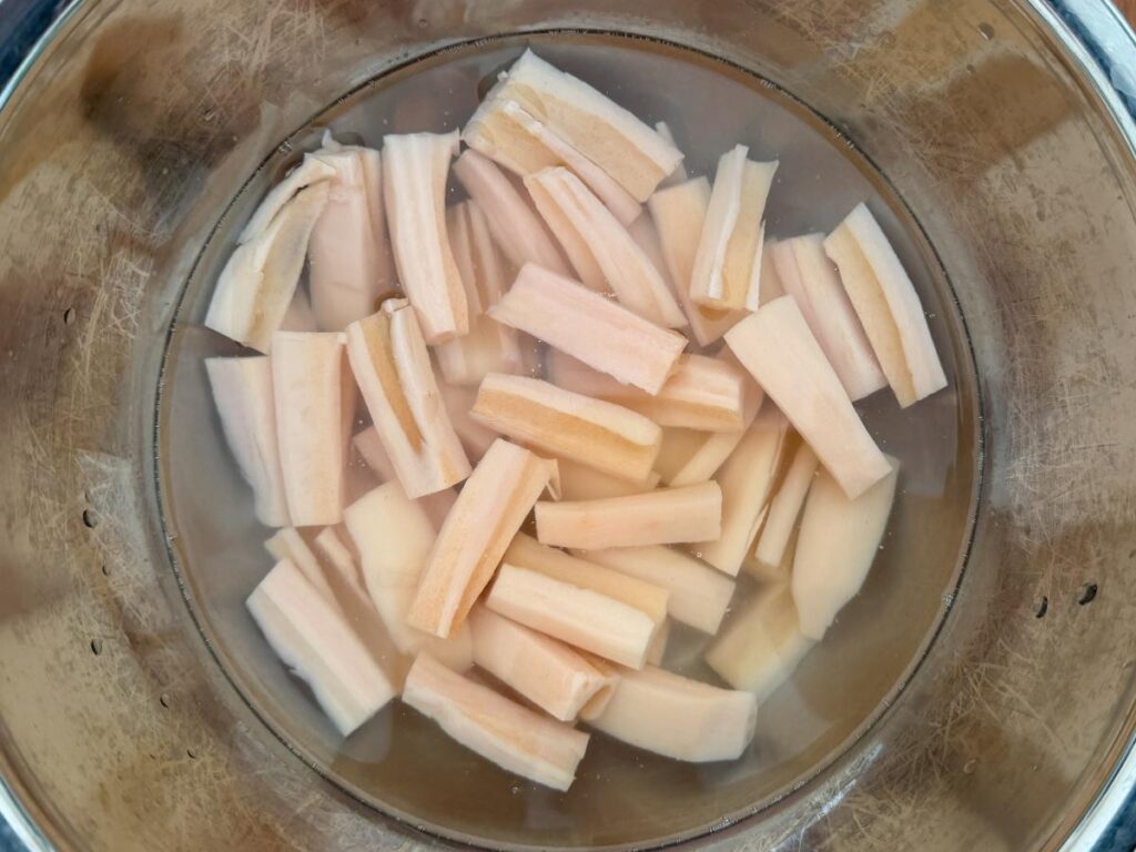 2)アク抜き: 変色を防ぐため、酢水(水500cc+酢小さじ1)に5分ほど浸け、水気をしっかり切ります。