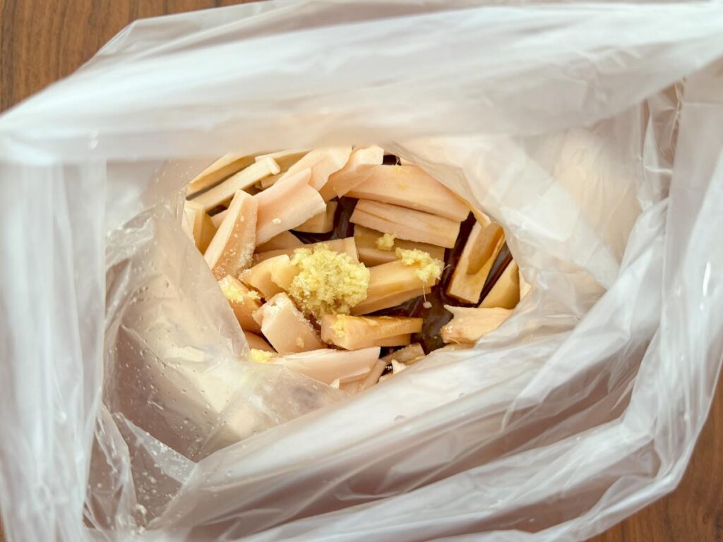3)味付け: ポリ袋に<調味料>をすべて入れ、れんこんを加えてよく揉み込みます。そのまま10分ほど置いて味をなじませます。
