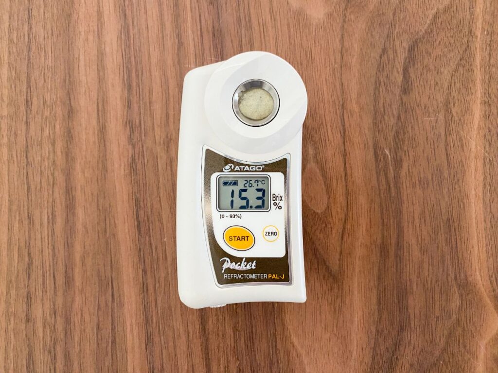 糖度計でおしりが黄色いりんごを測定した結果(15.3度 *13度以上だと甘いいわれます) *りんごの糖度は個体差があります。