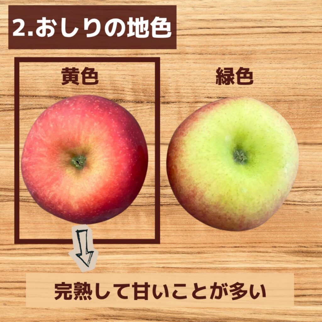 りんごのおしり(おへそ部分)は、日光が当たりにくく、熟度が最もわかりやすく表れる場所です。