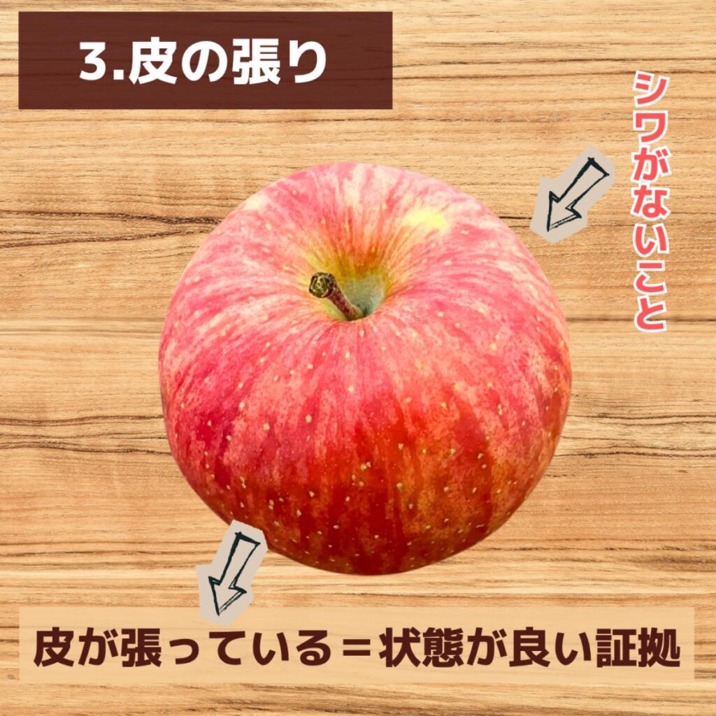 皮がピンと張ってツヤがあるりんごは、収穫後の水分がしっかり保たれています。