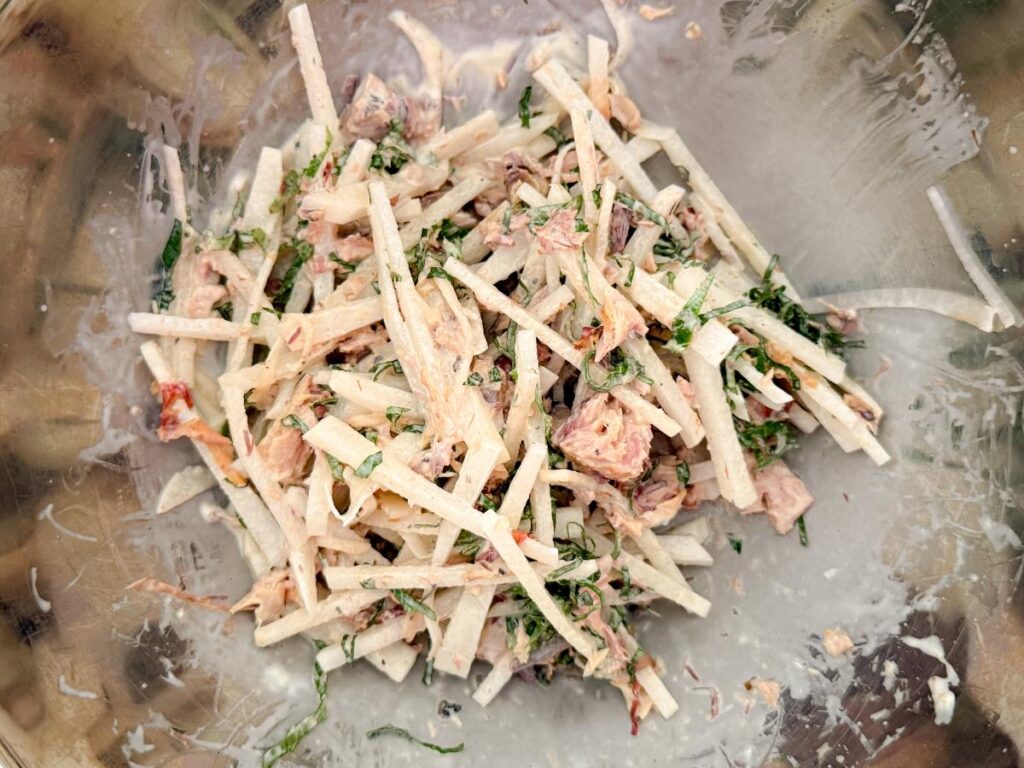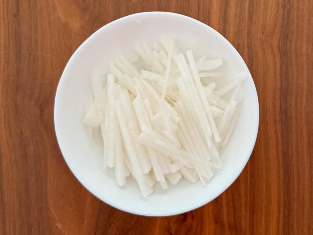 通常、大根サラダを作る時は水分を抜くために塩もみをすることが多いですが、今回はあえて塩もみしません。理由は2つあります。