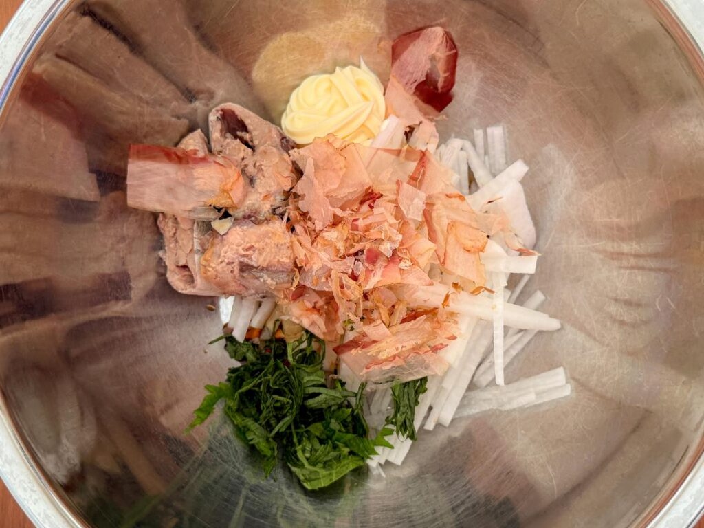 3)ボウルに汁気を切ったサバ缶、大根、大葉、鰹節、そして調味料(マヨネーズ、醤油、塩胡椒)をすべて入れます。