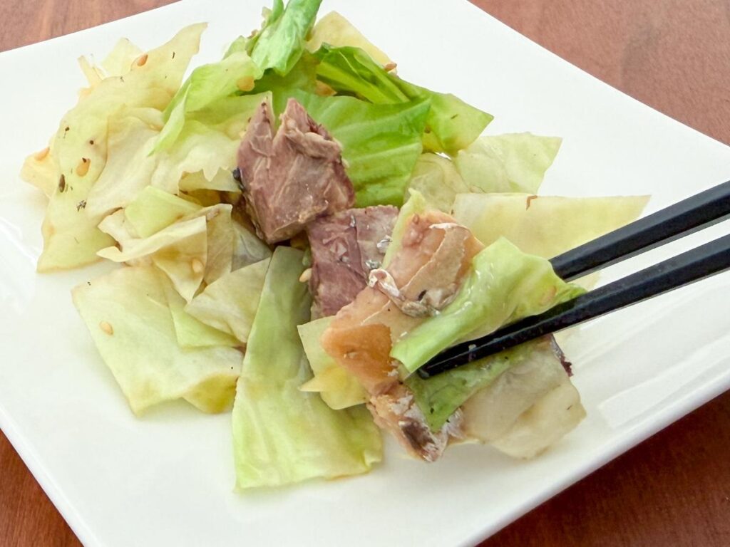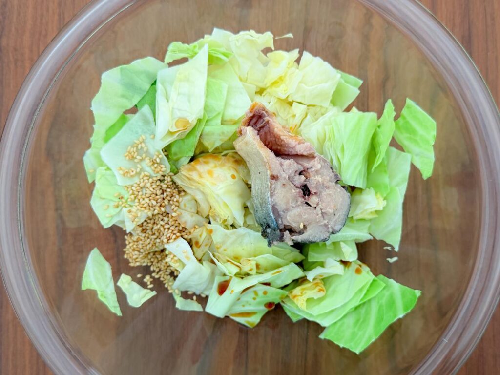 全体をよく和えれば完成です。サバの身を少し崩しながら混ぜると、キャベツ全体に旨味が行き渡ります。