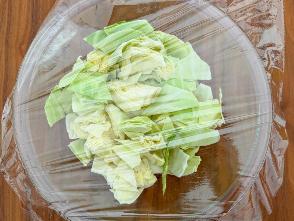 耐熱容器にキャベツを入れ、ふんわりとラップをかけます。600Wの電子レンジで4分加熱します。 加熱することでキャベツのカサが減り、驚くほど甘みが引き出されます。