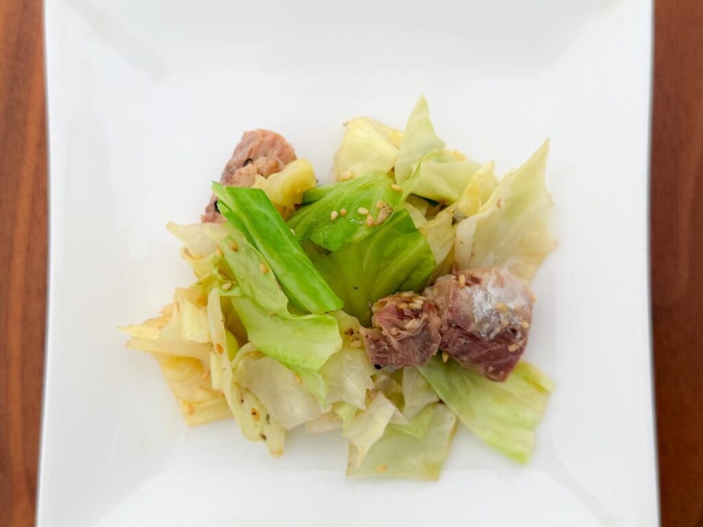 一口食べると、レンジで蒸されたキャベツの甘みが口いっぱいに広がります。
